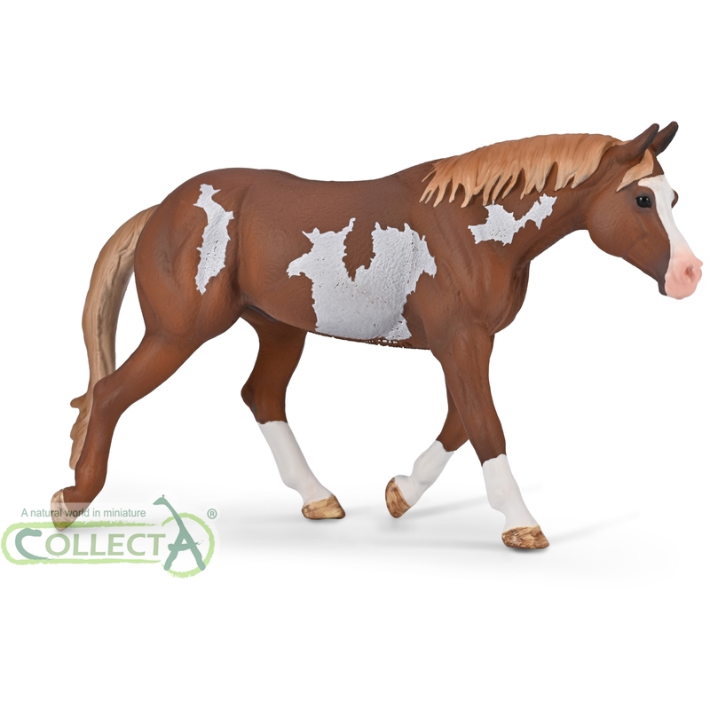 Αμερικάνικος Πέιντ Επιβήτορας καστανοκόκκινος οβέρο – Αυτά τα εντυπωσιακά άλογα κατάγονται από τις ΗΠΑ και είναι γνωστά για τον μοναδικό χρωματισμό τους. Είναι εξαιρετικά ευέλικτα και διαπρέπουν σε πολλούς ιππικούς αγώνες. Με τη συνεργάσιμη και προσαρμοστική τους φύση, τα Αμερικάνικα Πέιντ ξεχωρίζουν σε δυτικά αγωνίσματα, όπως σε αγώνες ροντέο ανάμεσα σε βαρέλια (barrel racing) και αγώνες χαλιναγώγησης (reining), καθώς και σε αγγλικά αγωνίσματα, όπως τα άλματα εμποδίων. Το μοντέλο της CollectA σχεδιάστηκε στο καστανοκόκκινο στικτό (overo) χρώμα και παρουσιάζει πλούσιο κόκκινο-καφέ τρίχωμα με ακανόνιστα λευκά μπαλώματα, που του προσδίδει έντονη αντίθεση. Όμορφες λεπτομέρειες όπως τα λευκά σημάδια στο πρόσωπο, που προοδευτικά καταλήγουν στο ανοιχτό ροζ ρύγχος, αποδίδονται με μεγάλη προσοχή. Επίσης, αποτυπώνονται εξαιρετικά η ομαλή κίνηση και ο μυώδης λαιμός. Το νέο μοντέλο της της CollectA, με την ισχυρή και ισορροπημένη κατασκευή του και τον ζωντανό χρωματισμό του, αποτελεί ένα τέλειο παράδειγμα του χαρακτηριστικού συνδυασμού δύναμης και ομορφιάς της φυλής.